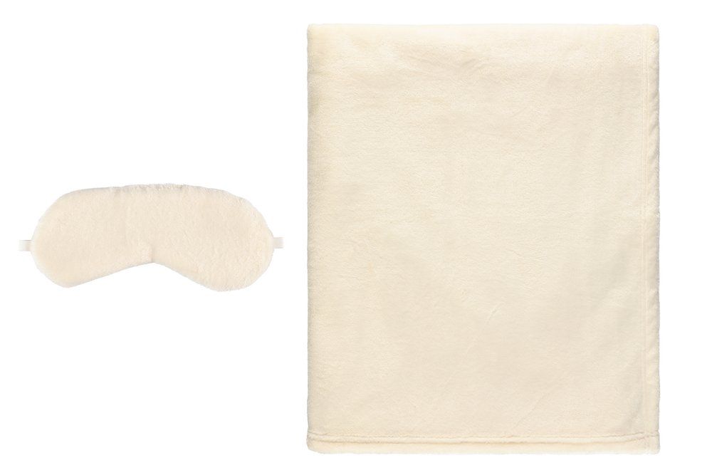 Комплектът включва меко одеяло и маска за сън.