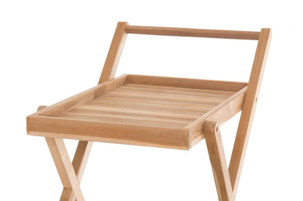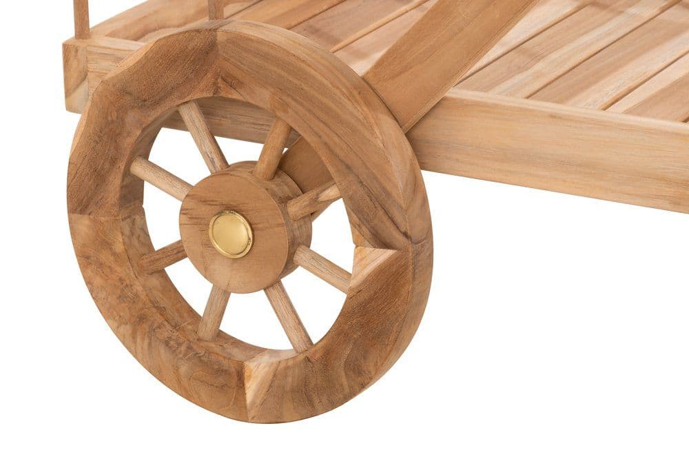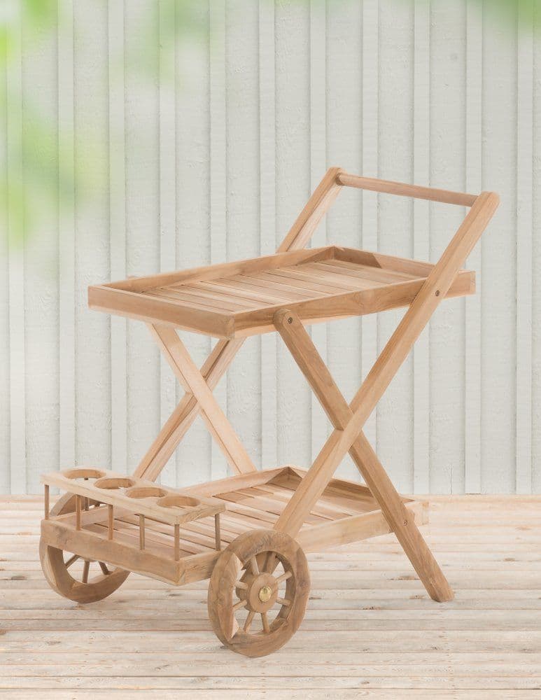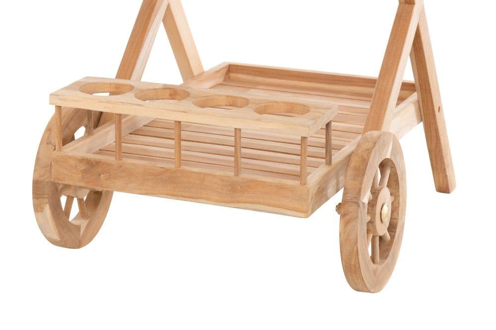 Количката за сервиране, изработена от тиково дърво, предлага допълнително място за съхранение, като лесно може да се премести там, където е необходима. Има обособени места за бутилки. Големите колела правят количката лесна за преместване.