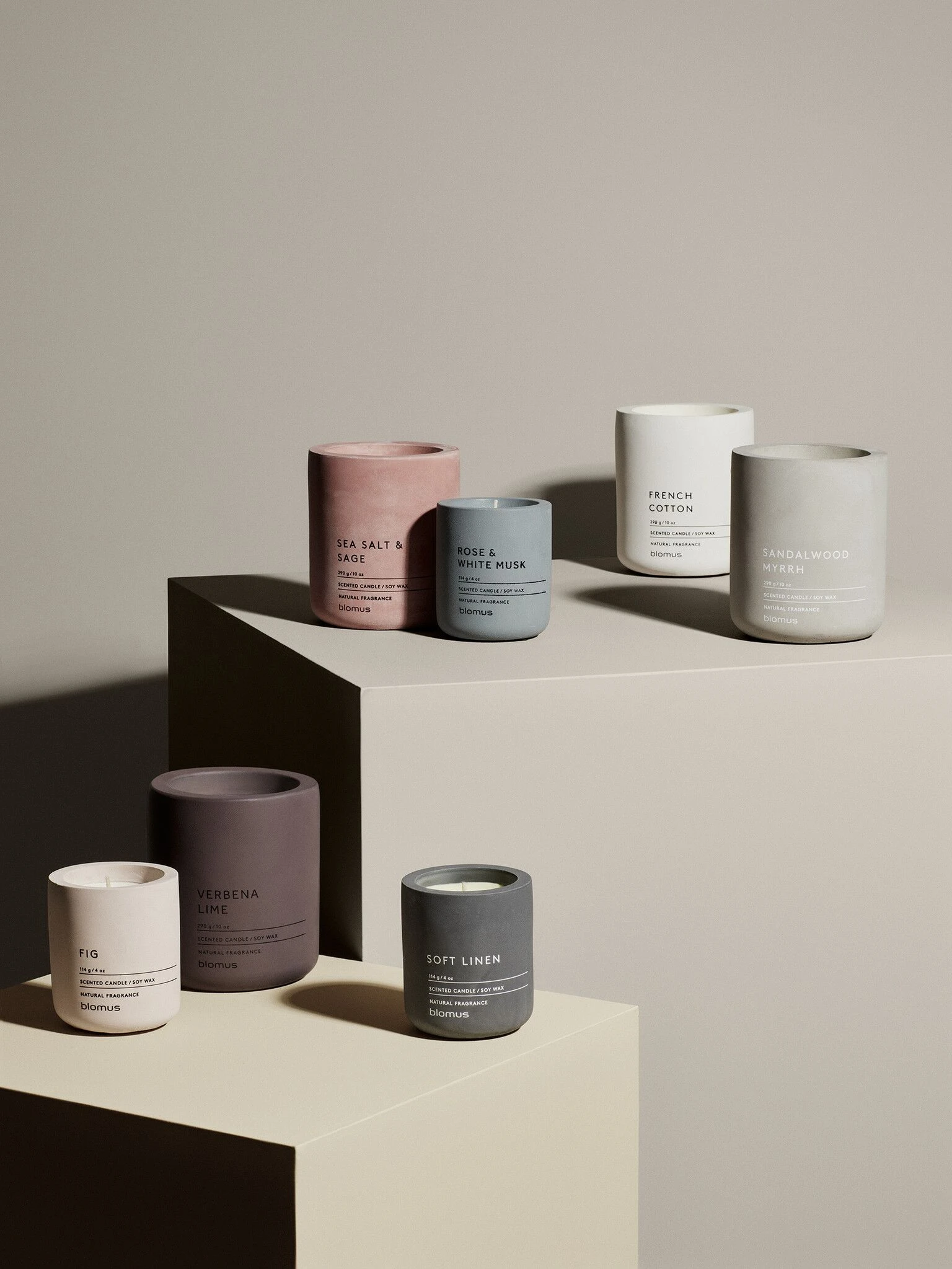 Свещите са изработени от соев восък и са в бетонни буркани в модерни цветове.