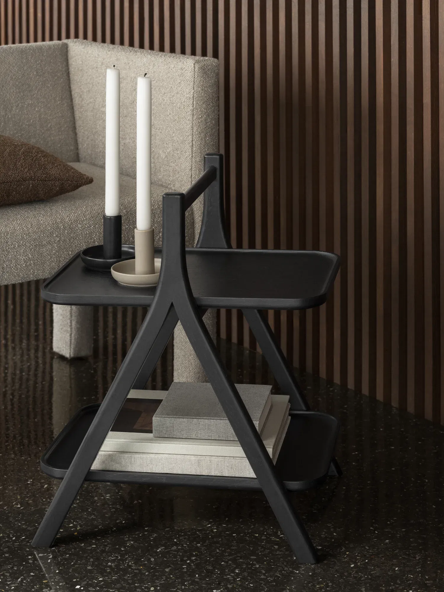 Страничната маса ETA предлага две просторни повърхности за съхранение и може да се премества навсякъде, благодарение на дръжката си за носене. Изработена е от масивен дъб, а шлайфаните и заоблени елементи правят дизайна ѝ не само тактилен, но и визуално ексклузивен.