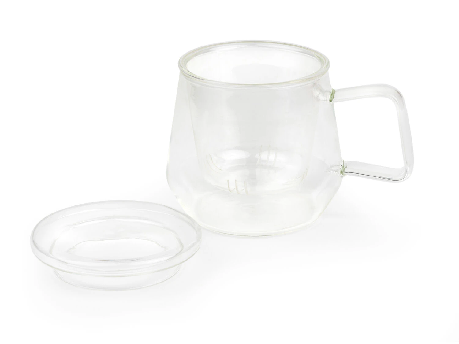 С този сет за чай Вие можете бързо и лесно да запарите чаша вкусен чай само за себе си. Сетът се характеризира с голям стъклен филтър за насипен чай и е произведен изцяло от топлоустойчиво боросиликатно стъкло. Капакът може да се използва за покриване на чашата, докато се запари чая, и като поставка за филтъра след това. Вместимост – 290 мл.