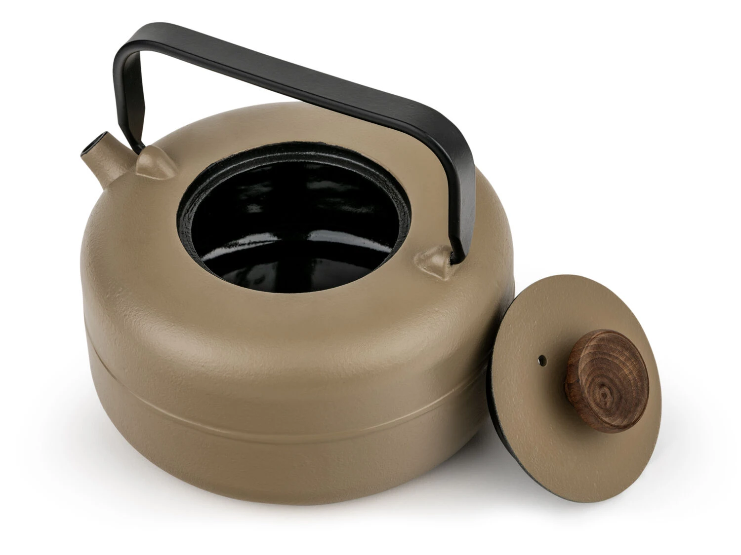 Кръглият, минималистичен дизайн и матовото покритие придават на чайника спокоен вид, докато дървената дръжка осигурява естествена изтънченост и комфорт при употреба.