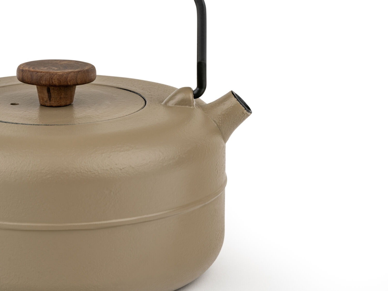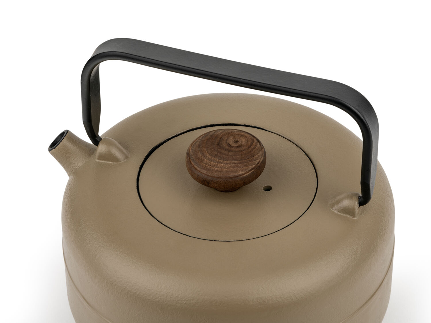 Кръглият, минималистичен дизайн и матовото покритие придават на чайника спокоен вид, докато дървената дръжка осигурява естествена изтънченост и комфорт при употреба.