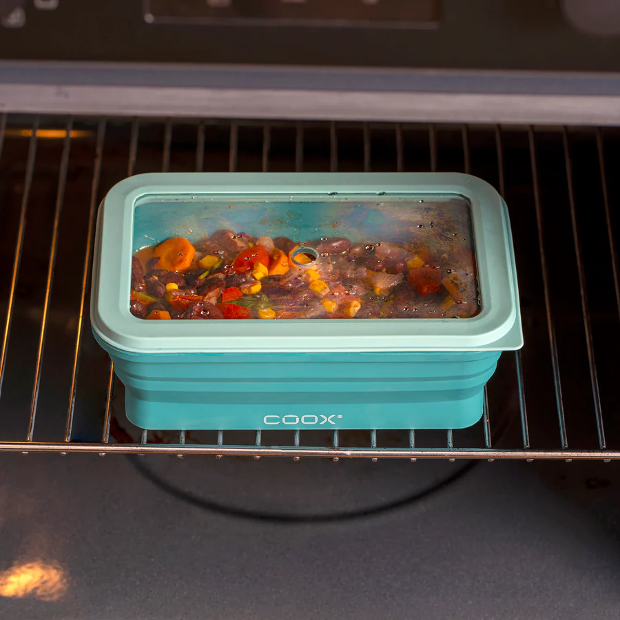 Сгъваемата кутия за съхранение на храна COOX в размер S с вместимост 250 мл. е идеална за малки порции, закуски или сосове. Изработена от висококачествен силикон, комбиниран със здрава стъклена основа и стабилен стъклен капак, тя предлага максимална функционалност в най-малкото пространство. Благодарение на компактния си дизайн, е идеална за приготвяне на храна или съхранение на остатъци от храна – независимо дали е в хладилник, фризер, фурна или микровълнова фурна. 100% херметичното уплътнение гарантира свежест и предотвратява течове, а сгъваемият дизайн спестява ценно място във Вашата кухня.