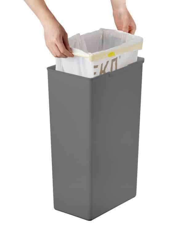 Благодарение на тесния си дизайн, кошът може да бъде поставен плътно до стената. Съдържа държач за торба за отпадъци и е без вътрешна кофа, оставяйки изключително голямо пространство за отпадъците. Рамката на държача на торбата за отпадъци я държи спретнато на място и далеч от погледа. Няколко коша за отпадъци могат лесно да бъдат свързани заедно с конектора, което ги прави идеални за разделяне на отпадъци.
