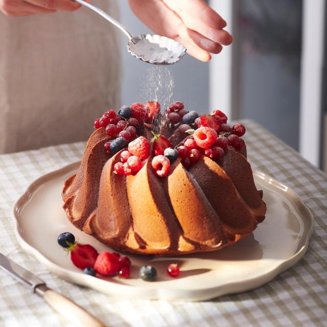 Мраморен кекс с ванилия и шоколад, кекс със сушени плодове, бриош с шамфъстък или торта — всичко ще изглежда прекрасно, сервирано с това красиво керамично плато на Emile Henry.