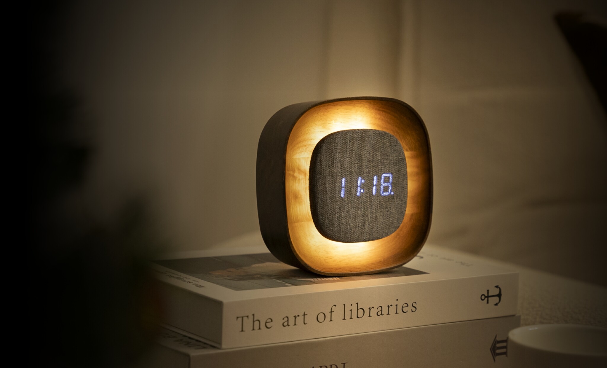 Конструкцията е от качествено дърво и мек текстилен дисплей, а USB-C батерията осигурява продължителна работа и без кабели по нощното шкафче, докато основата пази повърхността от надраскване.
