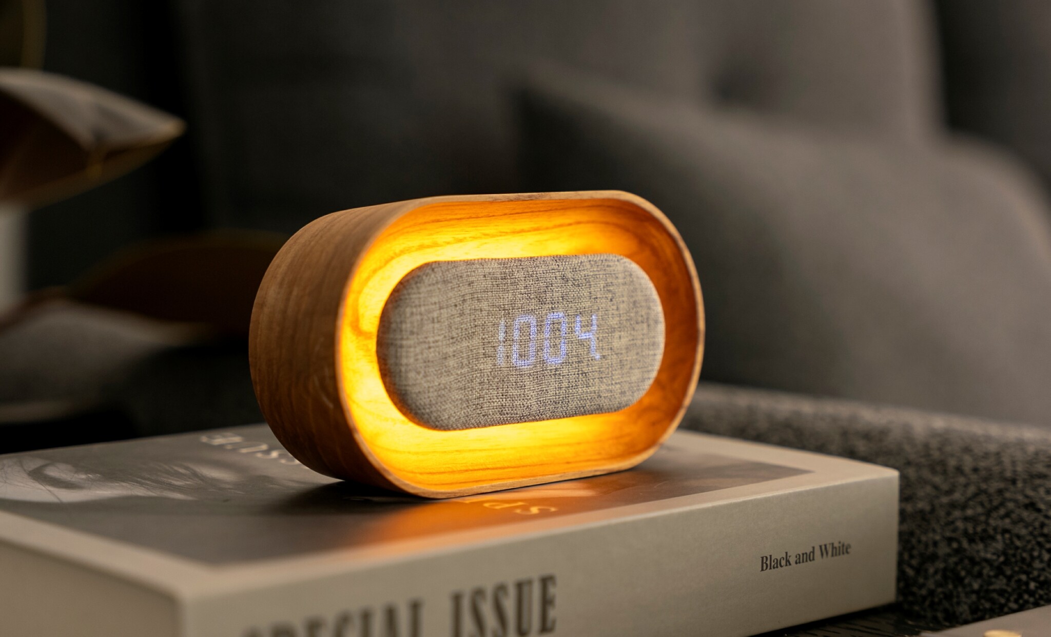 Конструкцията е от качествено дърво и мек текстилен дисплей, а USB-C батерията осигурява продължителна работа и без кабели по нощното шкафче, докато основата пази повърхността от надраскване.