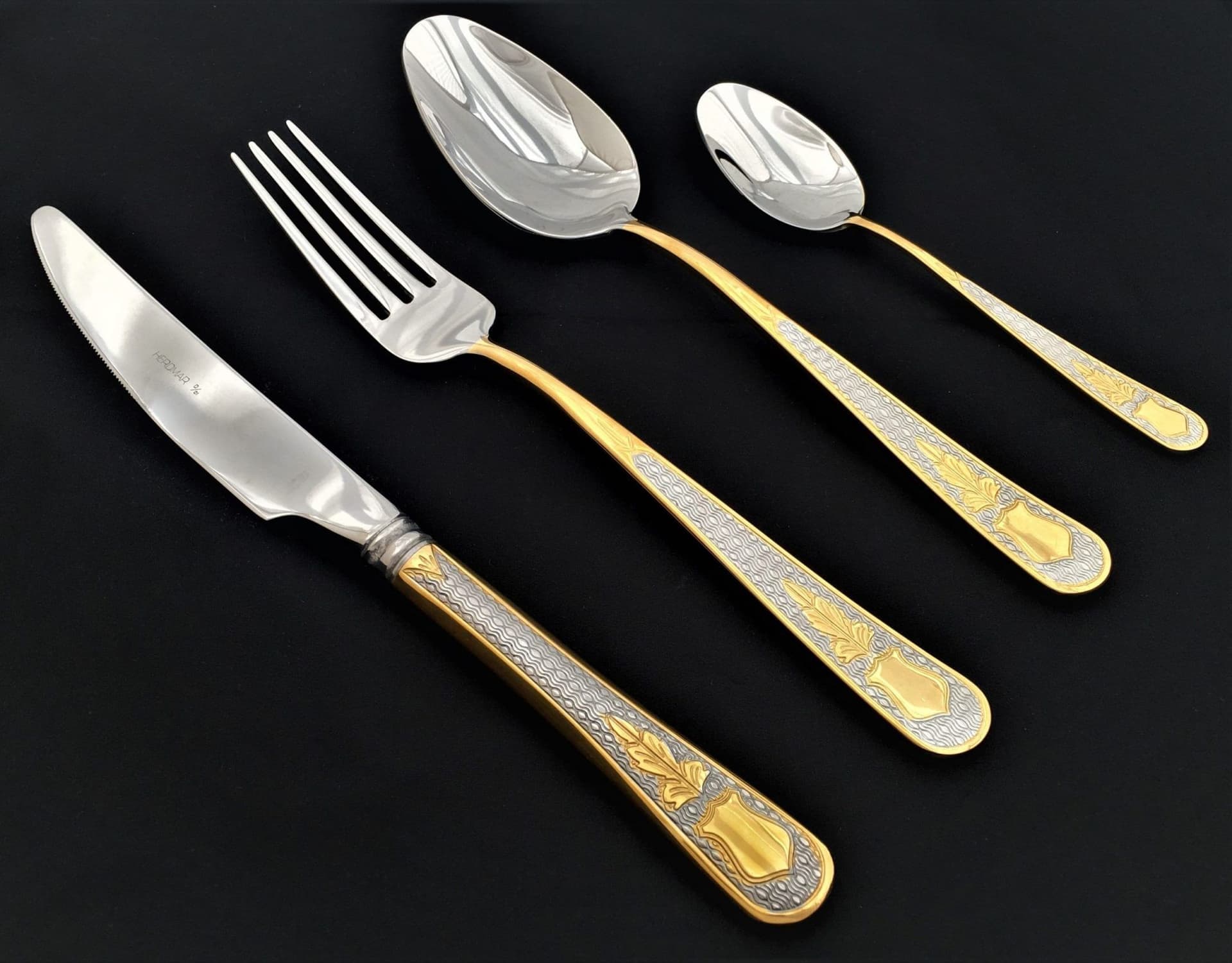 • Приборите за хранене със златно покритие имат покритие с дебелина от 3 или 4 микрона 24 карата злато