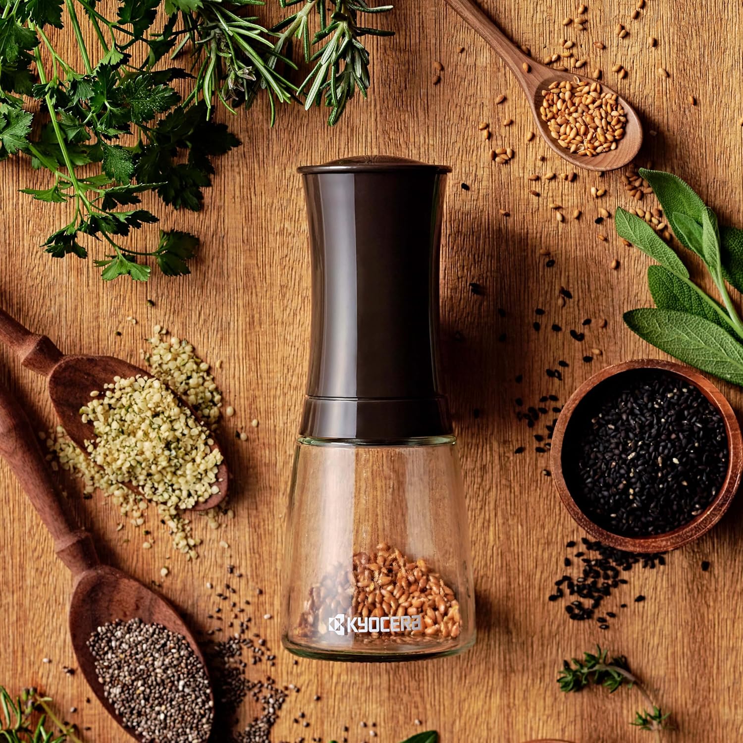 Мелничката за семена на билки и подправки Kyocera разполага с регулируем керамичен смилащ механизъм, който просто смила подправките до желаната едрина, без да променя вкуса им в процеса.
