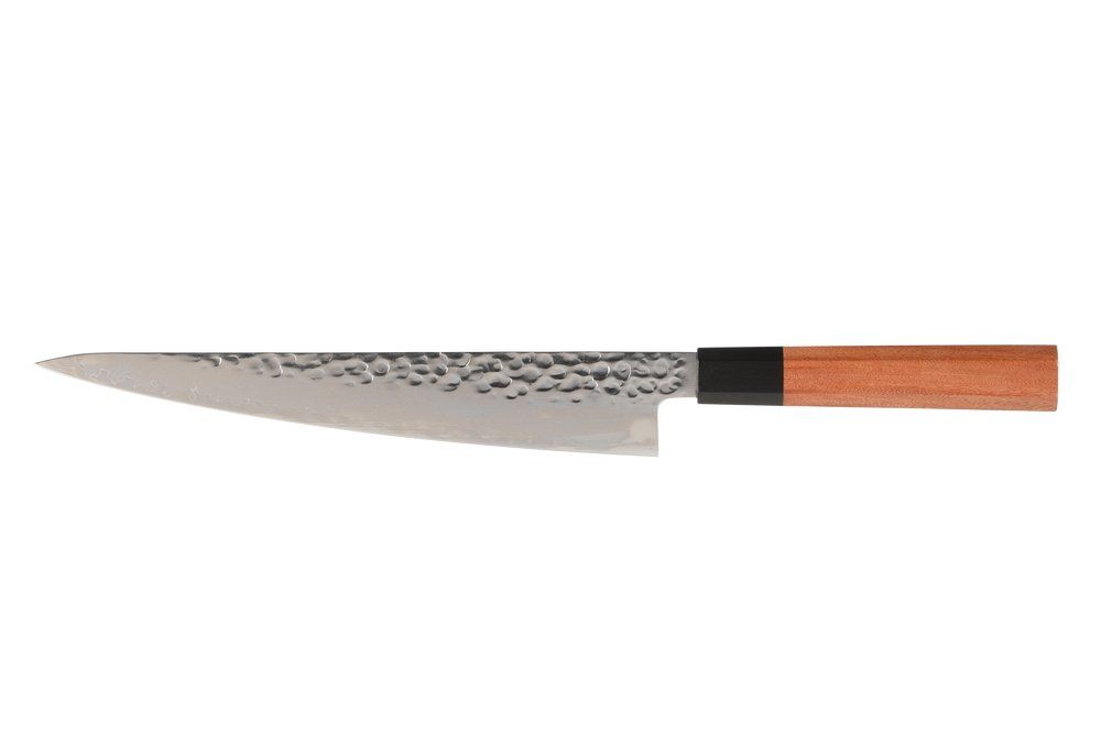 Острието на този нож е изработено по технологията на дамаската стомана, при която десетки слоеве стомана – в случая шестдесет и седем – се наслояват и коват заедно. Тази техника създава структура, в която твърдостта и здравината вървят ръка за ръка с гъвкавостта и устойчивостта на износване. С твърдост от около 58–60 HRC по скалата на Рокуел, острието запазва своята изключителна острота дори при продължителна употреба. Вълнообразният рисунък по повърхността не е декоративно нанесен, а е естествен резултат от наслагването на слоевете, което прави всяко острие уникално и неподражаемо. Допълнителна особеност е характерната „начукана“ или „кована“ повърхност (hammered finish), при която по острието се оформят малки вдлъбнатини. Те придават автентичен ръчен вид, но имат и практична функция – намаляват триенето и предотвратяват залепването на продуктите при рязане, особено на сочни зеленчуци и плодове.
