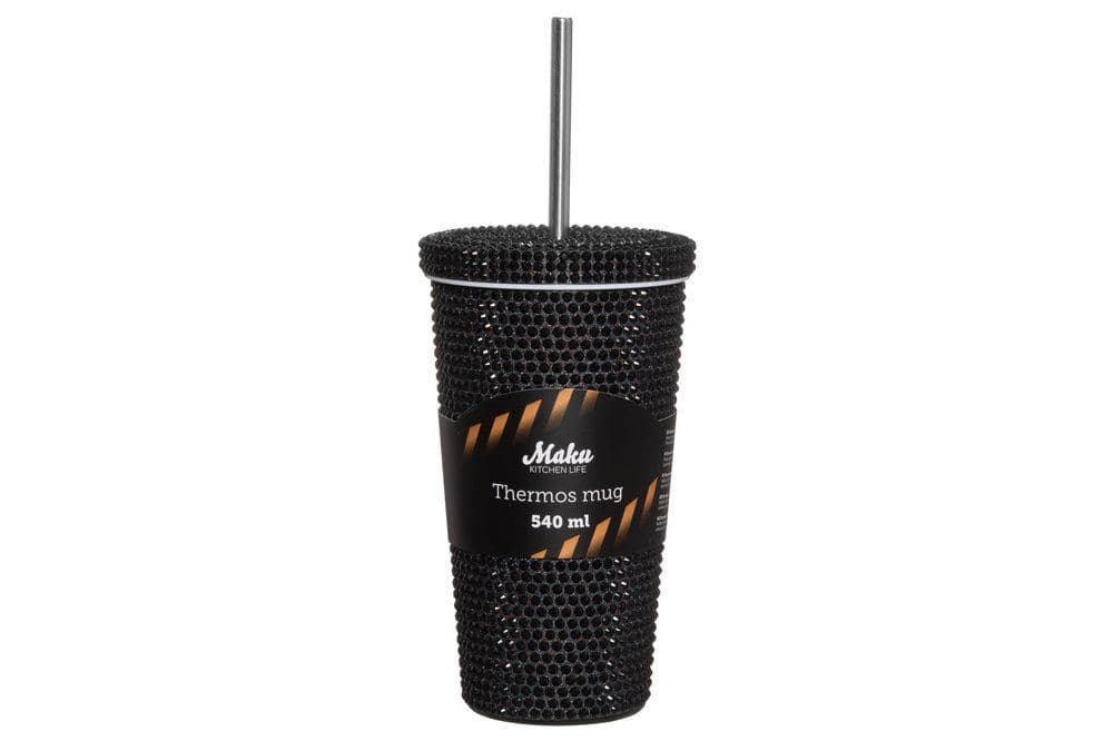 MAKU Термочаша със сламка и диамантен ефект “Deal“ – черна – 540 мл.