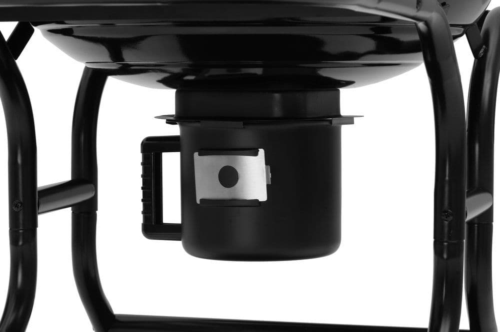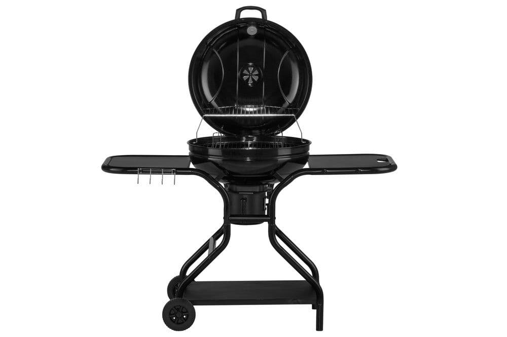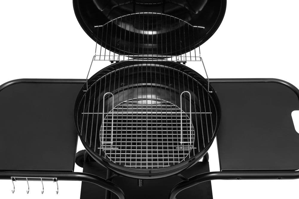Скара на дървени въглища със странични масички. Решетката за скара с Ø 54,5 см е изработена от хромирана стомана. Капакът и долната купа са от дебела емайлирана стомана. Под решетките има подвижен съд за пепелта. Чрез клапан в капака се регулира въздушния поток. Термометърът позволява лесно да се следи температурата вътре в скарата.