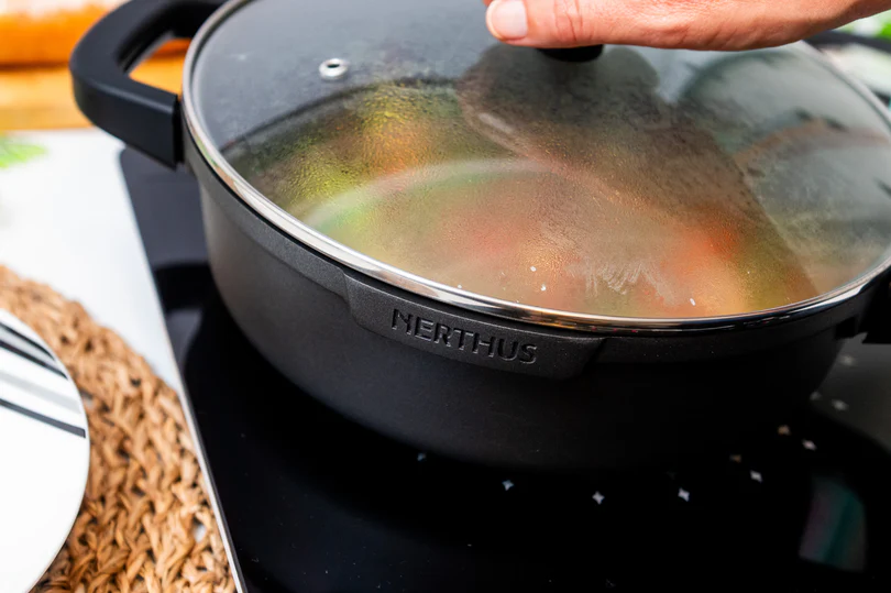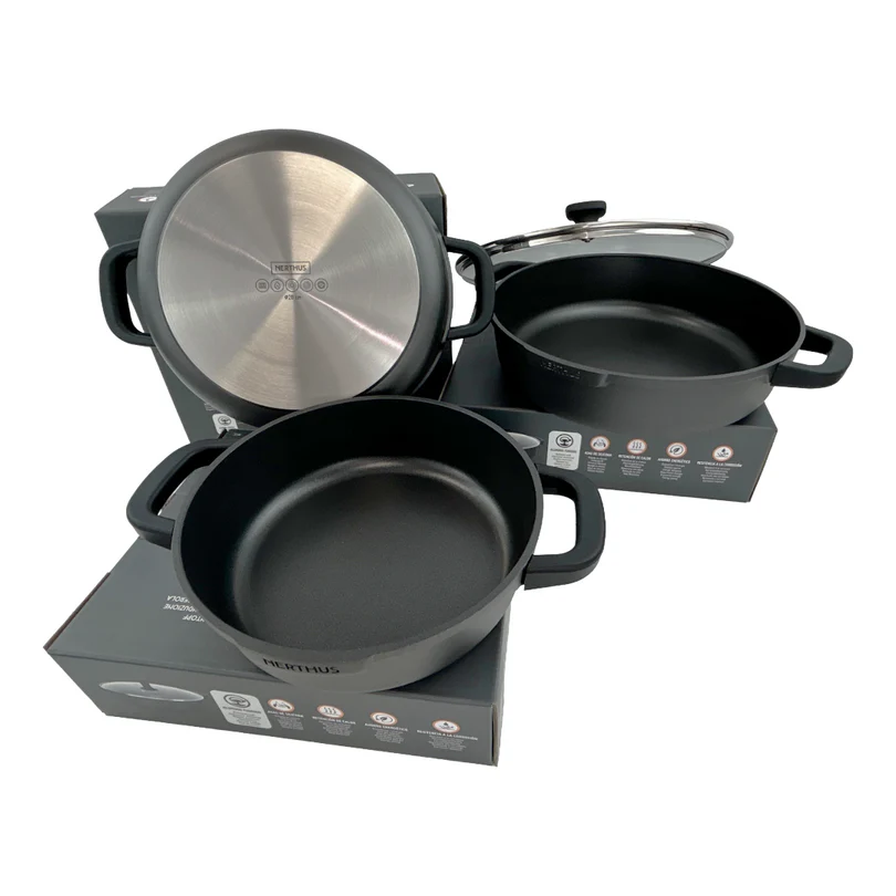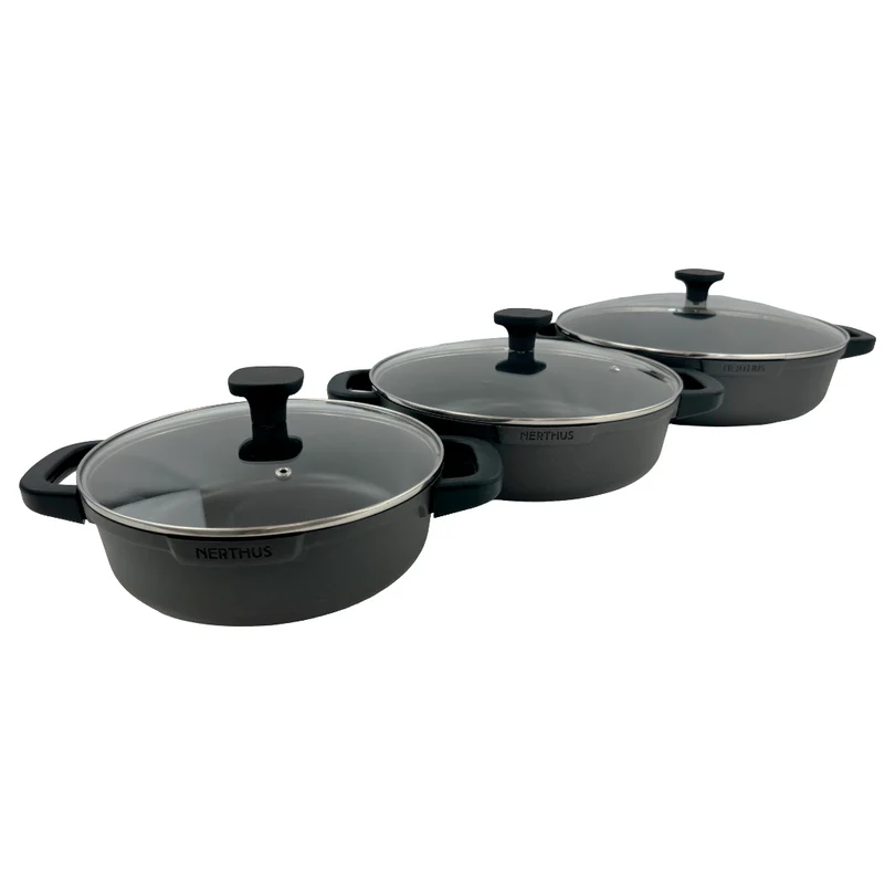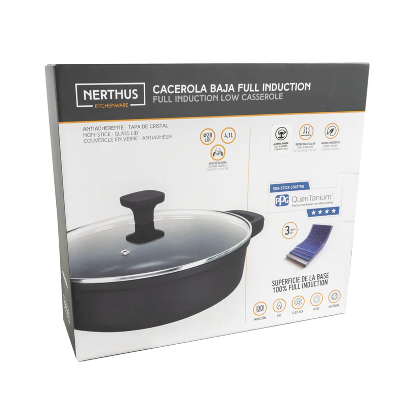 Плитката тенджерата от лят алуминий с капак и незалепващо покритие Quantanium на Nerthus е практичен и надежден съд за ежедневно готвене. Подходяща е за яхнии, сосове, варене, задушаване и ястия, които изискват равномерно разпределение на топлината.