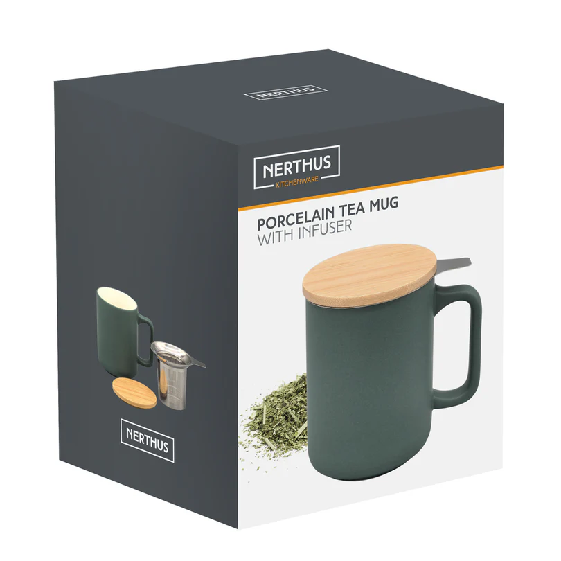 Nerthus Керамична чаша за чай със стоманен филтър и бамбуков капак – 375 мл – зелена
