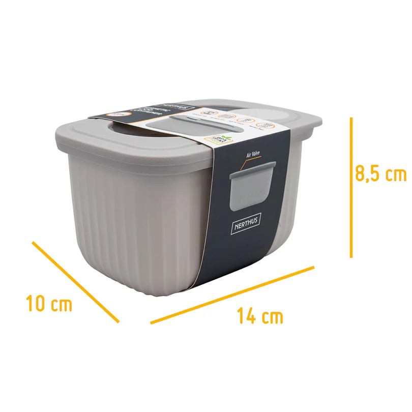 Представете си кутия, която съхранява храната Ви свежа благодарение на сигурен херметичен капак с вградена силиконова клапа. Тази кутия е направена от пластмасов материал, напълно без BPA, сертифициран за контакт с храна. Клапата позволява директно загряване в микровълнова фурна, без да се разлива съдържанието, а дизайнът – да се подреждат една в друга или върху друга, спестявайки място в хладилника или шкафа.