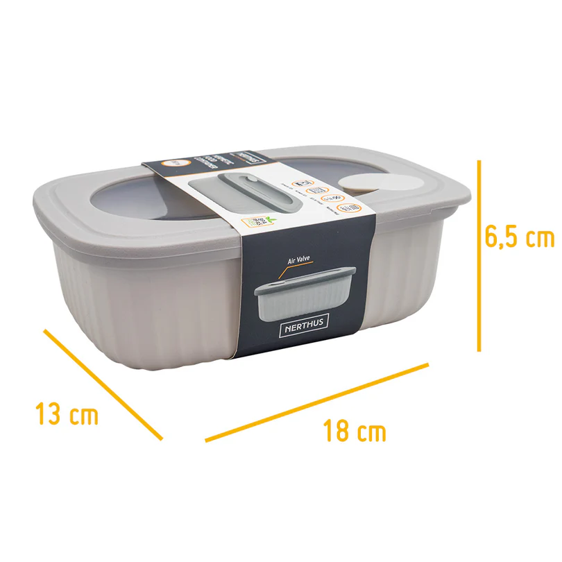 Представете си кутия, която съхранява храната Ви свежа благодарение на сигурен херметичен капак с вградена силиконова клапа. Тази кутия е направена от пластмасов материал, напълно без BPA, сертифициран за контакт с храна. Клапата позволява директно загряване в микровълнова фурна, без да се разлива съдържанието, а дизайнът – да се подреждат една в друга или върху друга, спестявайки място в хладилника или шкафа.