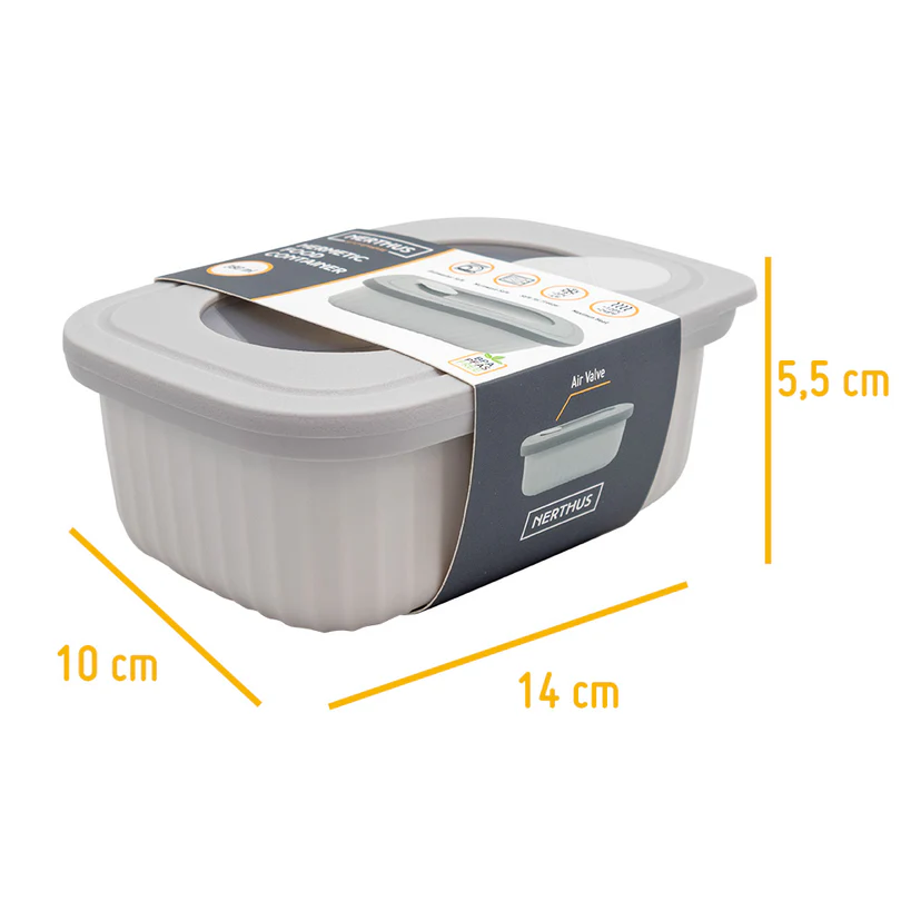 Представете си кутия, която съхранява храната Ви свежа благодарение на сигурен херметичен капак с вградена силиконова клапа. Тази кутия е направена от пластмасов материал, напълно без BPA, сертифициран за контакт с храна. Клапата позволява директно загряване в микровълнова фурна, без да се разлива съдържанието, а дизайнът – да се подреждат една в друга или върху друга, спестявайки място в хладилника или шкафа.