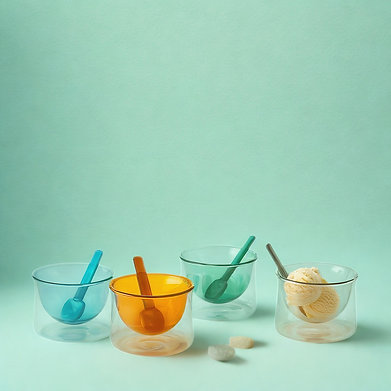Ръчно издуханите цветни чаши са с двойни стени, което запазва сладоледа студен за по-дълго време и добавя специален „плаващ“ ефект към всяка порция.  Независимо дали става въпрос за плодови сорбета, кремообразни творения или малки десерти – всичко се превръща в акцент в GELATO .