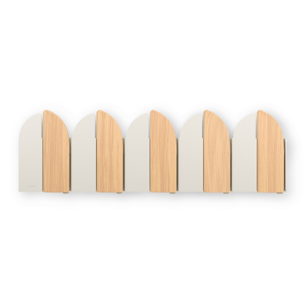 Петте сгъваеми куки предоставят удобен и организиран начин да се закачат връхни дрехи, чанти, шалове или други аксесоари. Когато не са в употреба, кукичките могат да се върнат обратно, така че стената да остане чиста и подредена — без излишни детайли.
