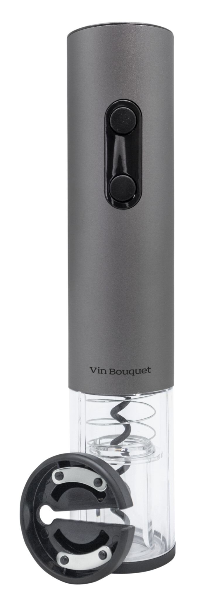 Работи с 4 бр. батерии, размер „АА“. В комплекта е включена стилна резачка за фолио, която има функция и на поставка за тирбушона.