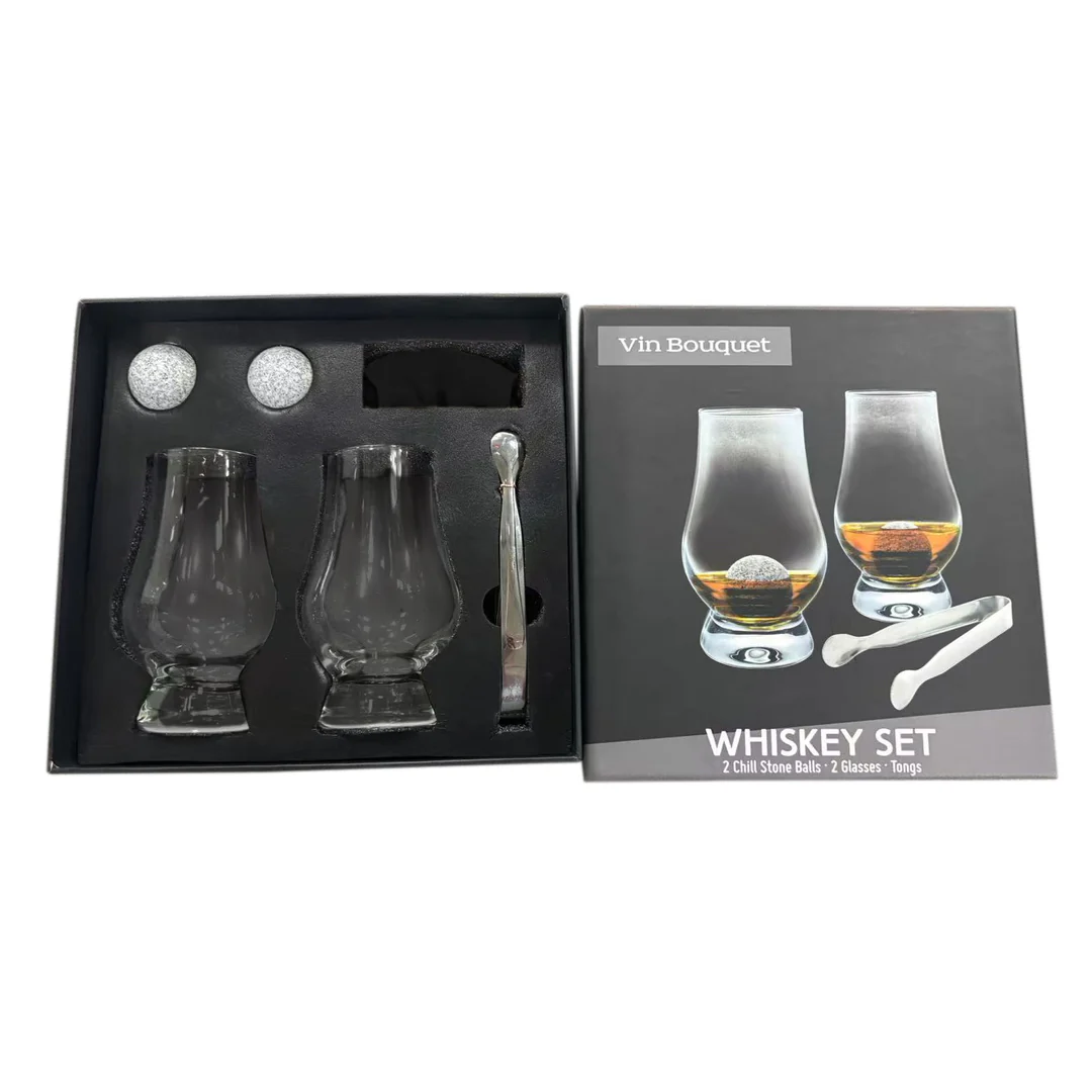 Комплектът за уиски на Vin Bouquet  е перфектният избор за тези, които ценят вечната елегантност. Чашите се отличават с елегантен и стилен дизайн и са изработени от прозрачно стъкло. Комплектът включва два кръгли гранитни камъка, които се охлаждат във фризер, за да поддържат напитката студена без да разреждат уискито и щипки от неръждаема стомана за лесно и хигиенично поставяне на камъните.