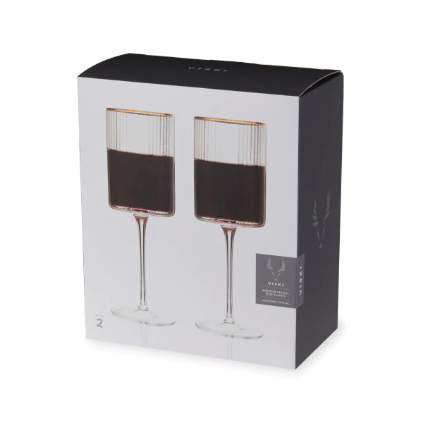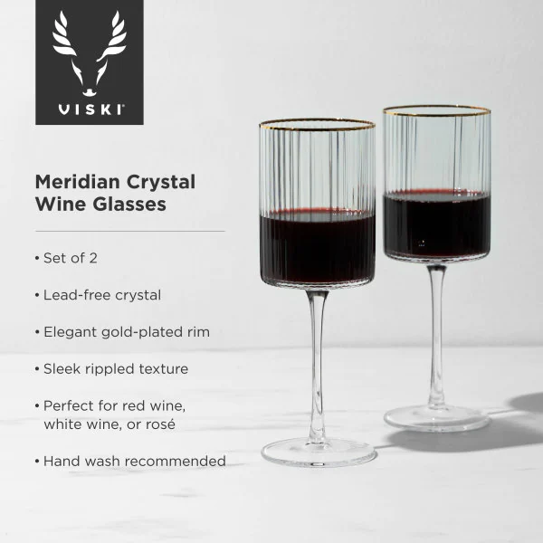 • <p><strong>VISKI Кристални чаши за вино “MERIDIAN“ 2 бр.<br />• В комплект 2 бр чаши<br />• Материал: </strong>безоловен кристал с галванизиран златен ръб<br /><strong>• Размер на 1 бр чаша: </strong>7,6 х 7,6 х 22,9 см (ШхДхВ)<br /><strong>• Вместимост на 1 бр чаша:</strong> 473 мл<br /><strong>• Тегло на 1 бр чаша: </strong>0,233 кг<br /><strong>• Размер на опаковката: </strong>23,8 х 12,4 х 28 см<br /><strong>• Тегло с опаковката: </strong>0,840 кг<br /><strong>• Ръчно измиване</strong><br /><strong>Производител:</strong> Viski® / САЩ</p><br />Марка: TRUEBRANDS <br />Модел: VISKI 11449<br />Доставка: 2-4 работни дни<br />Гаранция: 2 години