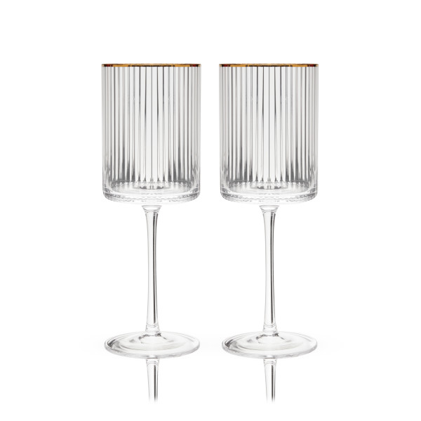 Изработени от искрящ безоловен кристал, те се отличават с уникална вълнообразна текстура и позлатени ръбове, вдъхновени от геометричната елегантност на архитектурата в стил Арт Деко.